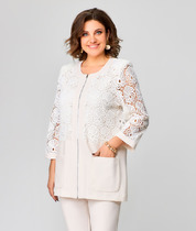 Жакет однобортный. Выполнен из эко-замши. Прямой крой, горизонтальный подрез ниже линии талии, подклад, разреза в спинке нет. Воротник с остроугольным лацканом. Застёжка контрастные петли-пуговицы. Карманы по переду внизу с клапаном без застёжки (функциональные), по груди карман-листочка (нефункциональный). Рукав втачной, на рукваве контрастные петли-пуговицы (нефункциональные), длина 65 см. Длина спинки 77 см