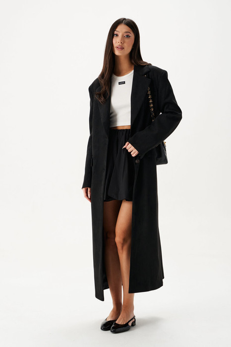 Жакет прямого свободного кроя, выполнен из имитации замши. Характеристики: прямой крой, подкладка, подплечники, отложной воротник, V образный вырез горловины, застежка центральная на две петли пуговицы, рукав втачной, по переду карманы с клапаном, в среднем шве заднего полотна изделия разрез 58 см. Длина изделия 131 см, длина рукава 64 см.