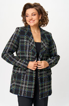 Жакет прямого кроя выполнен из полотна бежевого цвета. Характеристики: прямой крой, покладка, подплечники, отложной воротник с остроугольным лацканом, застежка центральная на петли пуговицы, по линии талии шлевки, в комплекте пояс из ткани основного изделия, рукав втачной. По линии плеча погон с пуговицей, в среднем шве заднего полотна изделия шлица 17 см. В боковых швах изделия карманы. Длина по спинке 65 см, длина рукава 58 см.