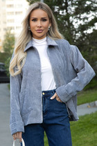 Жакет двубортный. Выполнен из полотна серо-перламутрового цвета с блеском. Полуприлегающий силуэт, подклад, отрезной бочок, приталиевые выточки по передней части. Воротник с остроугольным лацканом. Застёжка петли-пуговицы (декорированы тканью основного изделия). Карманы по переду внизу с клапаном без застёжки (функциональные). Рукав втачной, на рукаве петли-пуговицы (нефункциональные, декорированы тканью основного изделия), длина рукава от края горловины 80 см. Длина спинки жакета 72 см.