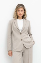 Жакет прямого свободного кроя выполнен из костюмной ткани. Характеристики: прямой свободный крой, подкладка, подплечники, воротник с остроугольным лацканом, застежка центральная на петлю - пуговицу, по переду функциональные карманы с клапаном, рукав втачной, по низу рукава нашиты пуговички, спинка со средним швом, в среднем шве шлица 48 см. Длина по спинке 77, длина рукава 62 см.