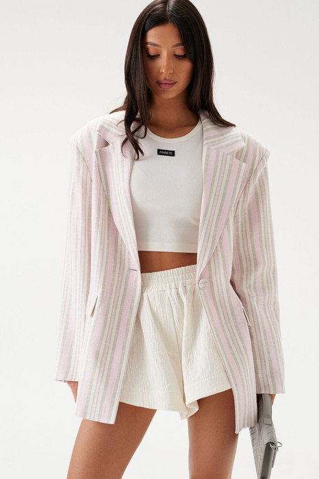 Жакет прямого свободного кроя выполнен из льняного (смесового) полотна бежевого цвета в розово-песочную полоску. Характеристики: прямой свободный крой, подкладка, подплечники, воротник с остроугольным лацканом, застежка центральная на петлю - пуговицу, по переду функциональные карманы с клапаном, рукав втачной, по низу рукава нашиты пуговички, спинка со средним швом, в среднем шве шлица 48 см. Длина по спинке 77, длина рукава 62 см.
