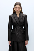 Жакет прямого свободного кроя. выполнен из фактурной эко-кожи чёрного цвета. С подкладкой. Воротник отложной. Рукав втачной, немного спущен. По переду накладные карманы. По окружности жакета подрез ниже линии талии. Спинка отрезная. Застёжка центральная пуговицы. Длина спинки 70 см. Длина рукава от линии втачивания 60 см