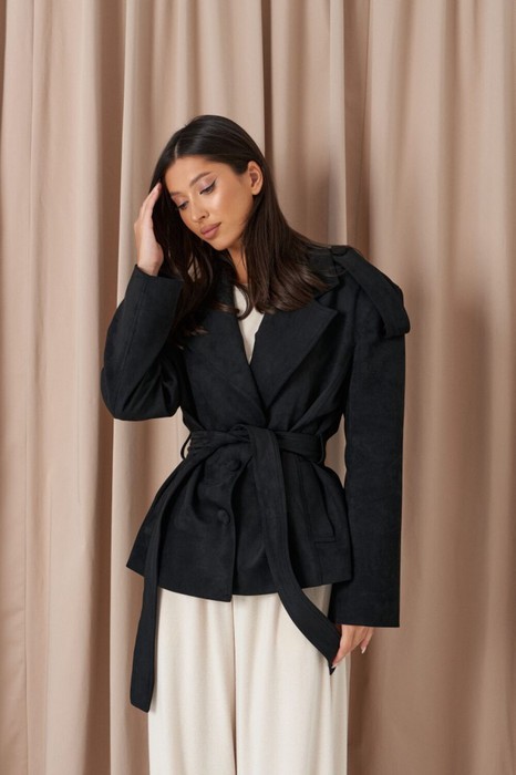 Жакет прямого кроя выполнен из экозамши черного цвета. Характеристики: прямой крой, брендированная покладка, подплечники, отложной воротник с остроугольным лацканом, застежка центральная на петли пуговицы, по линии талии шлевки, в комплекте пояс из ткани основного изделия, рукав втачной. По линии плеча погон с пуговицей, в среднем шве заднего полотна изделия шлица 17 см. В боковых швах изделия карманы. Длина по спинке 65 см, длина рукава 58 см.