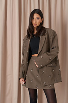 Жакет прямого кроя выполнен из эко-кожи бежевого цвета. Характеристики: прямой крой, брендированная покладка, подплечники, отложной воротник с остроугольным лацканом, застежка центральная на петли пуговицы, по линии талии шлевки, в комплекте пояс из ткани основного изделия, рукав втачной. По линии плеча погон с пуговицей, в среднем шве заднего полотна изделия шлица 17 см. В боковых швах изделия карманы. Длина по спинке 65 см, длина рукава 58 см.