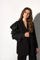 Жакет прямого свободного кроя выполнен из костюмной ткани черного цвета. Характеристики: прямой свободный крой, брендированная подкладка, подплечники, воротник с остроугольным лацканом, застежка центральная на петлю - пуговицу, по переду функциональные карманы с клапаном, рукав к низу расклешен, втачной, чуть спущен, по низу рукава нашиты пуговички, спинка цельнокроеная. Длина по спинке 77, длина рукава от края горловины 84 см.
