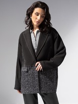 Жакет укороченный прямого кроя выполнен из текстильного полотна черного цвета. Характеристики: прямой крой, подкладка, воротник с остроугольным лацканом, подплечики, застежка на петли, пуговицы, втачной рукав, три пуговицы на манжете. Длина рукава 61см, длина изделия 39см.