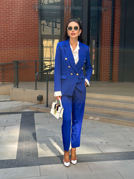 Двубортный жакет на подкладке, прямого силуэта. Обработаны прорезные карманы по переду. Рукава втачные одношовные, обработаны шлицей