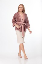 Жакет 2-бортный, на подкладке. Рукав короткий, втачной, одношовный, по окату собран складками дляя увеления объёма. Обработаны талиевые вытачки по переду и спинке изделия