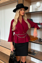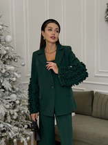 Жакет без подкладки, швы обработаны кантом в цвет изделия. Рукав втачной, прямой, одношовный. Воротник шаль. Застежка на притчной пояс, дополнен съёмной пряжкой золотистого цвета