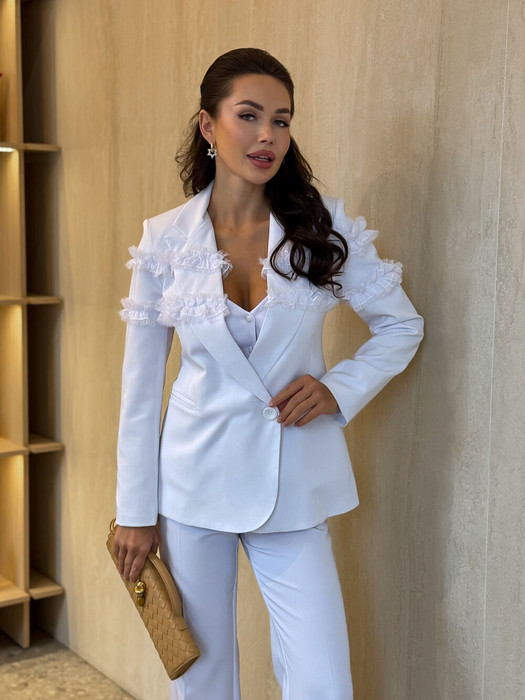Этот жакет - настоящая жечужина в гардеробе.  Небанальный вариант застёжки сбоку на лицевой стороне, и потайной пуговицей внутри  изделия придаёт жакету характер, подчёркивает силуэт и линию талии. Жакет выгодно акцентирует фигуру, создавая утончённый и женственный образ. Благодаря декоративным рюшам из вуали, он легко станет центральным элементом образа. Карманы с клапанами.