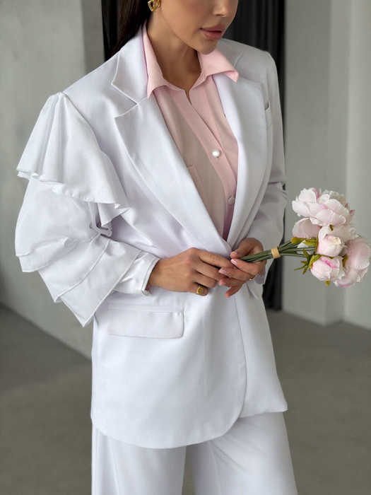 Жакет оверсайз силуэта с дизайнерским рукавом, сшитым из ярусов шифона и поплина, котрые придают легкий флёр воздушности. Жакет однобортный, обработан подкладкой, рукава втачные. Жакет, который легко станет акцентом для базового гардероба и для праздничных образов.