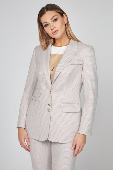 На передовой моды: модный однобортный жакет полуприлегающего силуэта с приятным рисунком в мелкую гусиную лапку, стильно подчёркнутый сочетанием карманов и интересным расположением пуговиц по борту. Приятная испанская ткань с добавлением вискозы прекрасно держит форму и обеспечивает свободу движений и комфорт. Рукава втачные двухшовные. На подкладке. Универсальный компаньон для множества нарядов.