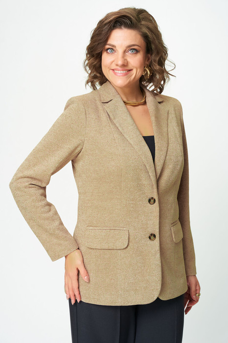 Жакет женский удлиненный, из трикотажной ткани, перед жакета на подкладке, полуприлегающего силуэта с центральной бортовой застежкой на пуговицы до линии перегиба лацкана. Спереди рельефные швы от плечевого шва, отрезной бочок и карман с клапаном. Спинка с рельефами от плечевого шва. Рукав втачной, двухшовный. Воротник пиджачного типа. Длина по спинке 70, длина рукава 61.