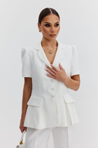 Жакет женский удлиненный, полуприлегающего силуэта с центральной бортовой застежкой на пуговицы до линии перегиба лацкана. Спереди рельефные швы от плечевого шва,отрезной бочок и карман с клапаном. Спинка с рельефами от плечевого шва. Рукав втачной, двухшовный, 3/4, с небольшим разрезом в локтевом шве. Воротник пиджачного типа. Жакет выполнен из джинсовой х/б ткани. Перед жакета на подкладке. Длина рукава 50, длина по спинке 68 см.