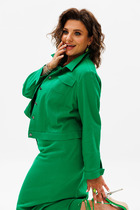 Жакет женский удлиненный, из текстильной ткани, на подкладке, полуприлегающего силуэта с центральной бортовой застежкой на пуговицы до линии перегиба лацкана. Спереди рельефные швы от плечевого шва, отрезной бочок и карман с клапаном. Спинка с рельефами от плечевого шва. Рукав втачной, двухшовный. Воротник пиджачного типа. Длина по спинке 66 см, длина рукава 62 см.
