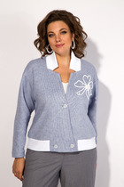 Жакет женский удлиненный, полуприлегающего силуэта с центральной бортовой застежкой на пуговицы до линии перегиба лацкана. Спереди рельефные швы от плечевого шва, отрезной бочок и карман с клапаном. Спинка с рельефами от плечевого шва. Рукав втачной, двухшовный, 3/4, с небольшим разрезом в локтевом шве. Воротник пиджачного типа. Перед жакета на подкладке. Длина рукава 50, длина по спинке 68 см.
