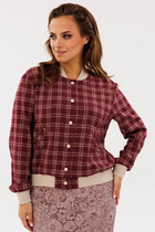 Женский жакет-блуза, прямого силуэта, из хлопковой ткани. Горловина округлой формы, застежка центральная на притачную планку, застегивается на металличесские кнопки. В отрезной части переда обработаны карманы. Спинка цельная. Низ фигурный. В боковых швах разрезы. Рукав втачной, двухшовный, с притачной манжетой, 3/4. Изделие без подкладки. По швам проложены отделочные строчки. Длина рукава 46 см, длина по спинке 86 см.