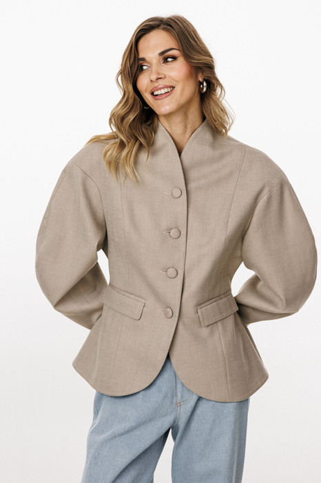 Жакет выполнен из костюмной ткани. Жакет О-образного силуэта, длиной до линии бедер. По переду обработаны рельефы от плечевого шва до низа, прорезные карманы с клапанами, и центральная бортовая застежка на 4 петли и пуговицы. Низ борта округлой формы. На спинке обработаны два рельефа от горловины до низа и средний шов. Горловина округлой формы, обработана цельнокроеным воротником-стойкой. Плечевой шов удлинен. Рукав фигурной формы, двухшовный, заужен к низу. Жакет с плечевыми накладками.