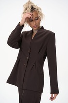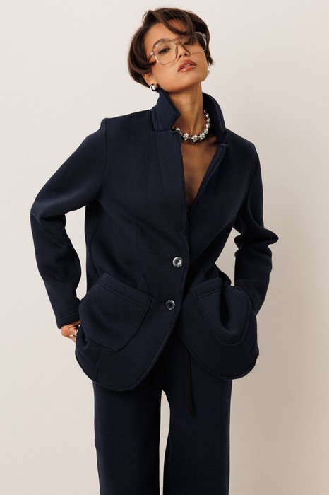 Жакет в стиле smart casual. Жакет прямого силуэта с пиджачным воротником, имеет удобные накладные карманы и застежку на 2 пуговицы. На левом лацкане вышивка-логотип в цвет ткани. Низ и борта имеют открытые края (эффект необработанного шва), укреплены дополнительной строчкой. Жакет без подкладки.