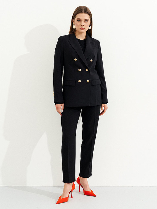 Стильный  двубортный жакет с золотыми пуговицами бренда Ketty покорит вас своим полуприталенным и актуальным кроем. Пиджак выполнен из высококачественной вискозной ткани. Жакет с лёгкостью впишется в любой гардероб и станет вашим бесспорным фаворитом. Посадка добавит силуэту пиджака изящества, а образу элегантности. Жакет удлиненный двубортный с прорезными карманами с клапанами, на рукавах имеются декоративные шлицы, которые дополняют изящные золотые пуговицы. Такой классический жакет, но с ярким акцентом на пуговицы прекрасно подойдет девушкам для вечерних образов, в офис, на работу, на свидание, на прогулку.