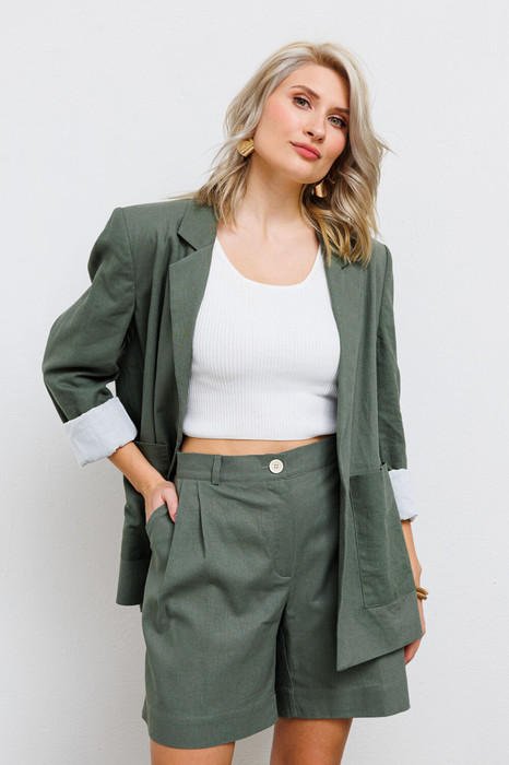 Жакет прямого кроя без застежки. По переду накладные карманы. По спинке 2 шлицы, которые можно расстегнуть для более легкого образа. Жакет на хлопковой подкладке.