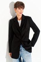 Жакет однобортный умеренного объема, приталенного силуэта. Силуэт изделия создается за счет отрезных бочков на спинке и полочке, а также за счет среднего шва и плечевых вытачек на спинке. На полочке нагрудная вытачка переведена в плечевой шов. Плечевой пояс расширен и поддерживается плечевыми накладками. Рукав втачной, длинный, двухшовный. Воротник отложной с отрезной стойкой, пиджачного типа. Застежка на уровне линии талии на одну петлю и пуговицу. Жакет полностью обработан притачной подкладкой. Длина изделия до середины бедер. Фурнитура и материалы отделки могут незначительно отличаться от тех, что на фотографи.