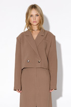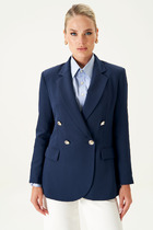 Двубортный жакет умеренного объема, полуприлегающего силуэта. Нагрудные вытачки на полочках расположены вертикально и совмещены с талиевыми, заканчиваются входом в карман. Карманы прорезные, в рамку с клапаном. Спинка имеет плечевые вытачки, средний шов со шлицей. Рукава двухшовные, длинные. Воротник – стойка переходит в край борта, имеющий V-образную форму. Застежка на прорезные петли и пуговицы. Жакет полностью обработан притачной подкладкой. Длина изделия до середины бедра. Длина по спинке 71 см, длина рукава 61 см.
