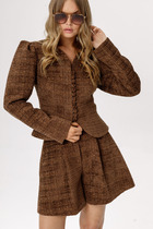 Однобортный жакет на подкладке прямого силуэта с застёжкой на две петли и пуговицы. По талии расположена кулиса и шнурок для приталивания жакета. По переду расположены накладные карманы с клапаном и декором. Длина жакета по спинке 68-72 см.