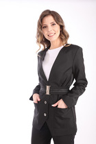 Однобортный жакет на подкладке прямого силуэта с застёжкой на две петли и пуговицы. По талии расположена кулиса и шнурок для приталивания жакета. По переду расположены накладные карманы с клапаном и декором. Длина жакета по спинке 68-72 см.