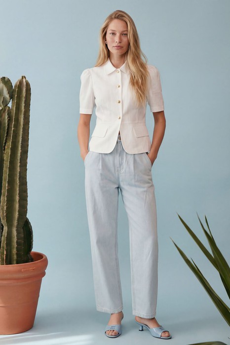Жакет выполнен из льняной ткани, без подкладки. Рукав короткий со сборкой по окату. Классический рубашечный воротник на стойке, застёжка центральная на петли и пуговицы. По переду вертикальные рельефы, линия талии отрезная с притачной баской, которая мягко раскрывается книзу, создавая баланс между структурой и легкостью. По баске декоративные клапаны по бокам. По спинке: средний шов, рельефы и баска.