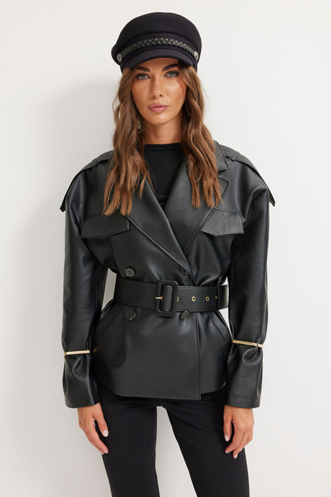 Жакет прямого силуэта из экокожи. Воротник пиджачного типа с двубортной застежкой на петли и пуговицы. Плечо расширенное. Рукав двухшовный длинный, на плече  декоративная пата. По переду декоративные клапаны, функциональные карманы с листочками. Жакет на подкладке. В комплект входит ремень. Обращаем ваше внимание, что фурнитура может отличаться от фото.