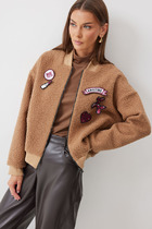 Жакет прямого силуэта из трикотажного полотна. Горловина-стойка, по центру застежка на молнию. Рукав со спущенной линией плеча, по низу манжета. По переду карманы с декоративными листочками. Жакет без подкладки. В комплект входит съемный декор. Обращаем ваше внимание, что фурнитура может отличаться от фото.