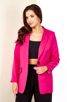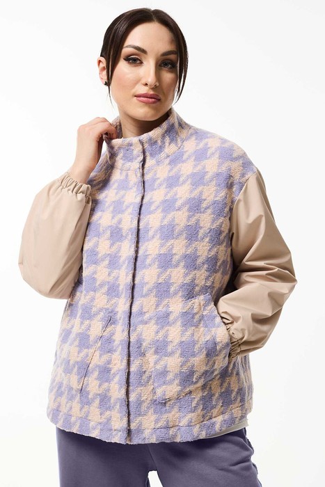Жакет свободного силуэта с центральнойзастежкой на пришивные кнопки. По переду обраюотаны накладные карманы. Рукав втачной одношовный, из отделочной ткани. Воротник - стойка. Частичная подкладка по переду и спинке.