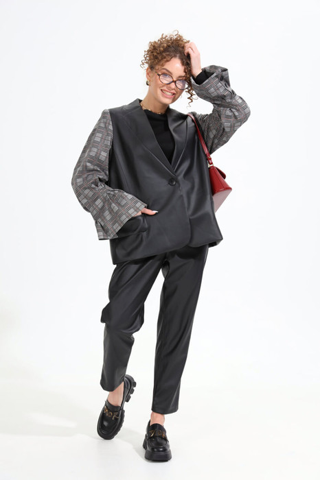 Жакет комбинированный оверсайз прямого силуэта. Застежка центральная на петлю и пуговицу. В изделии спроектирована имитация лацканов и воротника с отрезной стойкой. Боковой шов отсутствует. Перед с прорезными карманами. Спинка со средним швом. Рукав втачной двухшовный, с открытой шлицей в локтевом шве. В нижней части рукава расположены складки-защипы.