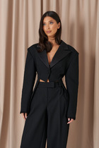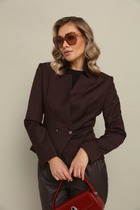 Жакет прямого силуэта с имитацией центральной застёжки на пуговицы. Рукав втачной одношовный, длиной три четверти,застегивающийся на пату. Воротник пиджачного типа . Линия низа фигурная, симметричная . По левому переду расположена декоративная деталь.