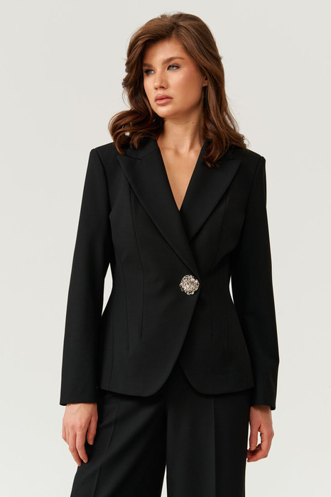Женский жакет из поливискозной ткани, идеально подходящий для повседневной и деловой носки. Центральная застежка выполнена на одну обметанную петлю и одну металлическую декоративную пуговицу, что придает модели элегантный вид. Край борта оформлен фигурной линией, добавляющей изящества. Передняя часть украшена двумя рельефами, не доходящими до низа, и одним выходящим из бокового шва рельефом, создающим интересные объемы и линию силуэта. Спинка выполнена со средним швом и тремя рельефами, что обеспечивает хорошую посадку и стильный дизайн. Горловина обработана пиджачным воротником, а длинные втачные рукава дополняют образ. Жакет на подкладке, что обеспечивает комфорт и аккуратность посадки. Модель выполнена в классическом черном цвете, что делает ее универсальной для различных образов и ситуаций.
