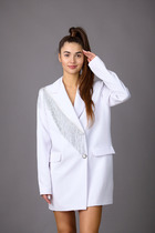 Детали: жакет полуприлегающего силуэта, талиевые вытачки, пиджачный воротник, застежка на две петли и пуговицы, функциональные карманы, рукава и спинка со шлицами, жакет на подкладке.