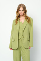 Детали: полуприлегающий силуэт, рельефы переда и спинки, талиевые вытачки, пиджачный воротник, застежка на петли и пуговицы, втачные длинные рукава с разрезами и застежкой на потайную молнию, функциональные карманы с клапанами, жакет на подкладке.