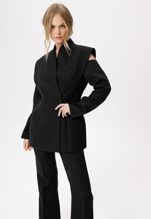 Детали: полуприлегающий силуэт, цельнокроеный воротник-стойка, двубортная застёжка на петли и пуговицы, рельефные швы переда и спинки с декоративным элементом, рукава длинные с вырезами по верху, функциональные карманы, жакет на подкладке.