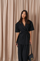 Детали: жакет прямого силуэта, удлинённая линия плеча, втачной одношовный рукав с ассиметричными складками, функциональные карманы, центральная застёжка на петлю и пуговицу, жакет на подкладке, съемный пояс.