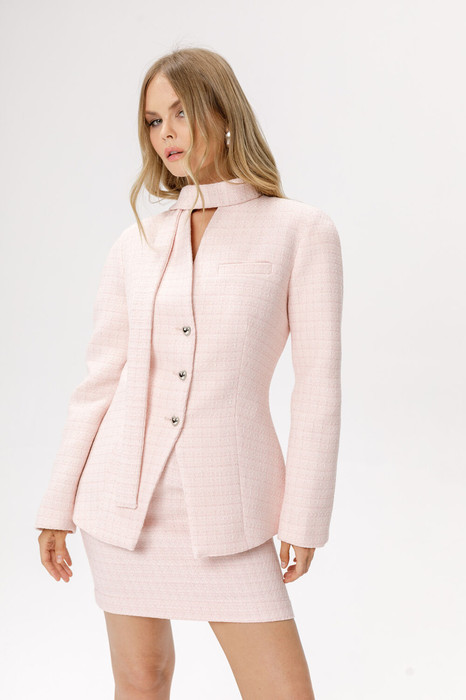 Приталенный твидовый жакет с акцентными плечами и съемным шарфиком (приобрести брюки с фото можно по арт. 6557, приобрести юбку с фото можно по арт. 6612).