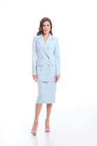 Модель полуприлегающего силуэта, с рельефами, на частичном подкладе.Спереди центральная потайная застёжка на петли и пуговицы, прорезные карманы в рамку с клапаном, а также нагрудный карман с листочкой. Средний шов спинки снизу заканчивается шлицей. Воротник английский. По низу рукава имитация шлицы с отделочными петлями и пуговицами. Жакет декорирован швами с открытыми срезами.