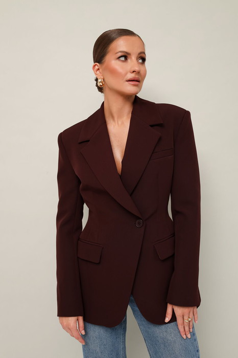Силуэтный жакет с подчеркнутой линией талии. Смещенная застежка на петлю и пуговицу. Воротник пиджачного типа с отложными лацканами, край борта скругленный по низу жакета. Спереди обработаны прорезные карманы в рамку с клапанами и нагрудный прорезной карман с листочкой. Рукава втачные, двухшовные с отлетнымм шлицами. Спинка с рельефами и средним швом, переходящим в шлицу. Изделие на подкладке.