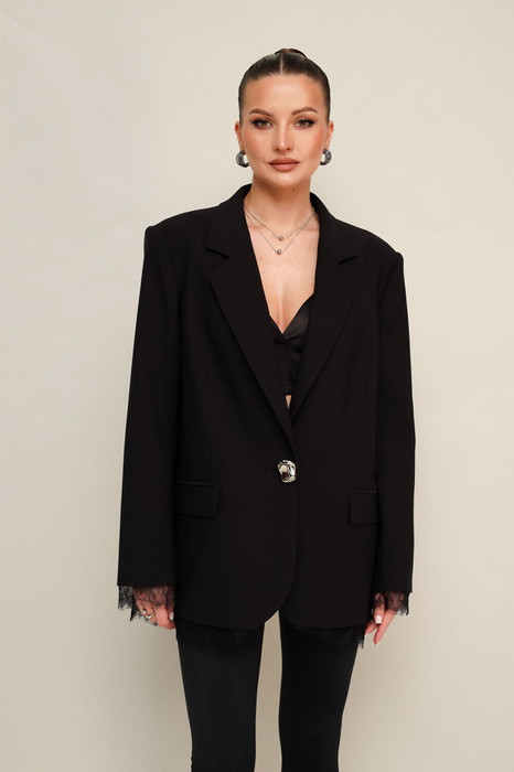 Жакет актуального прямого кроя, выполнен из костюмной ткани. Воротник пиджачного типа с отложными лацканами, край борта скругленный по низу жакета. Спереди обработаны прорезные карманы в рамку с клапанами. Рукава втачные двухшовные. Спинка со средним швом. Низ жакета и рукавов декорирован французским кружевом. Жакет обработан подкладкой.
