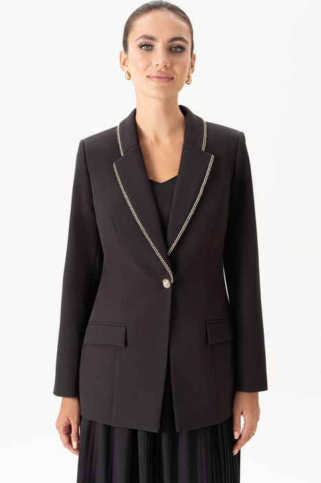 Этот жакет – воплощение элегантности и сдержанной роскоши. Его строгий крой подчеркивает утонченность образа, а изысканная отделка лацканов добавляет блеск и акцентирует внимание на декольте. Деликатные пуговицы с декоративными элементами завершают образ, придавая завершенность и утонченность. Идеальный выбор для деловых встреч или вечерних мероприятий, этот жакет подчеркнет вашу уверенность и безупречный вкус.
