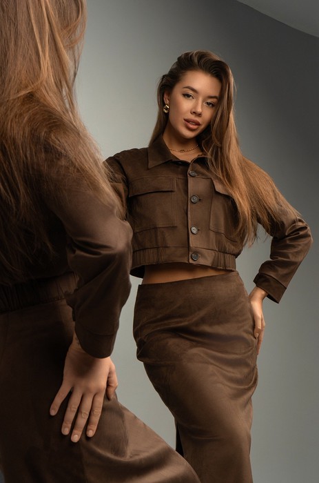 Однотонный коричневый костюм выполнен из экозамши, которая подарит мягкость и легкость, а также обеспечит идеальную посадку. Искусственная замша отличается своей долговечностью и приятной бархатистой текстурой, которая создаёт ощущение роскоши и уюта.