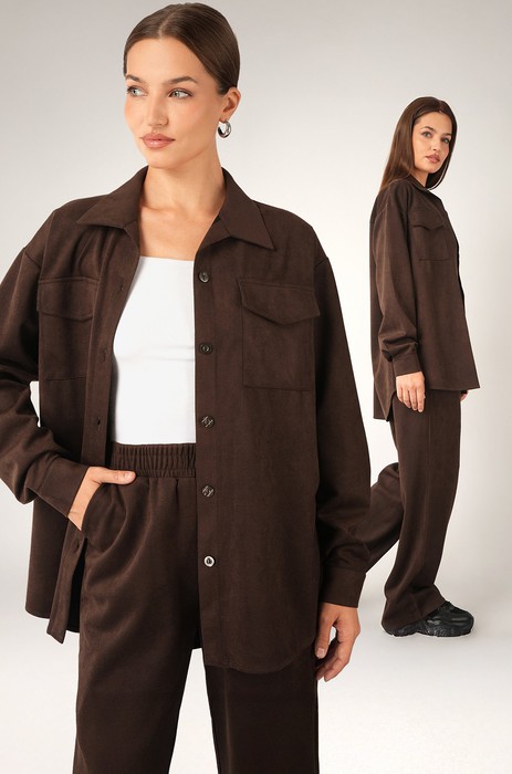 Брюки палаццо на резинке и рубашка оверсайз с нагрудными карманами создают женский комплект, который одинаково уместен для девушек и женщин и в офисе, и на прогулке. Коричневый вельветовый костюм будет незаменим как базовый, даря комфорт в осенний или весенний сезон.