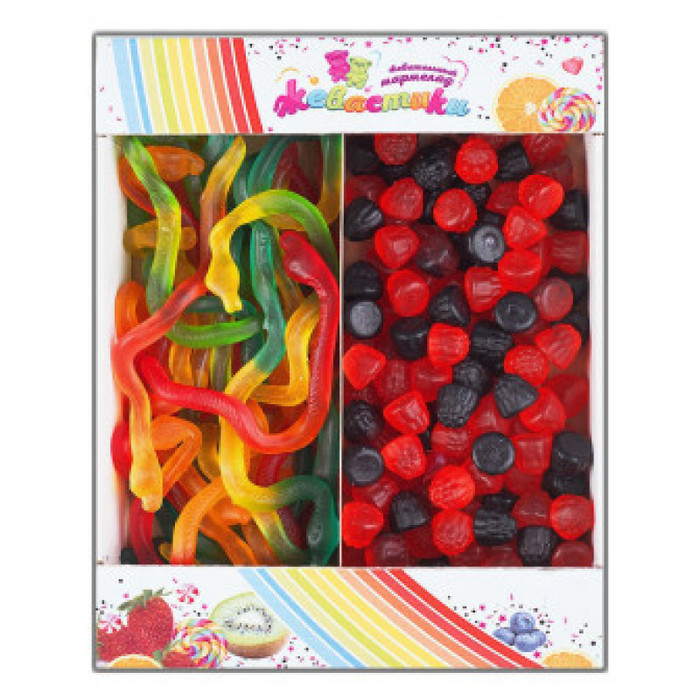 Мармелад Жевастики - фруктовый сочный жевательный мармелад с натуральным соком, выполненный в форме цветных фигурок. Уникальная возможность попробовать два вида мармелада в одном наборе: 1) Мармелад в форме Ягод 350 гр - ароматные и вкусные мармеладки в форме ягодок поднимут настроение каждому, это отличный выбор для угощения детей и взрослых. 2) Мармелад Змейки 350 гр - фруктовый жевательный мармелад с натуральным соком, выполненный в форме цветных змеек. Мармеладные змейки станут любимым лакомством всех детей и взрослых, они очень вкусные, в меру сладкие, с насыщенным фруктовым вкусом и приятной кислинкой. Кроме того, мармелад можно использовать как декор для домашних пирожных и тортов. Яркий и красивый дизайн коробки позволяет использовать мармелад в качестве подарка для родных и близких.
