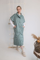 Жилет прямого кроя с поясом. Выполнен из твидовой ткани с пайетками розового цвета. Воротник отложной. Застёжка центральная на петли-пуговицы (декорированы тканью основного изделия). Карманы прорезные, с листочкой (функциональные). В боковых швах шлёвки для пояса. Пояс из ткани основного изделия. Длина спинки 70 см
